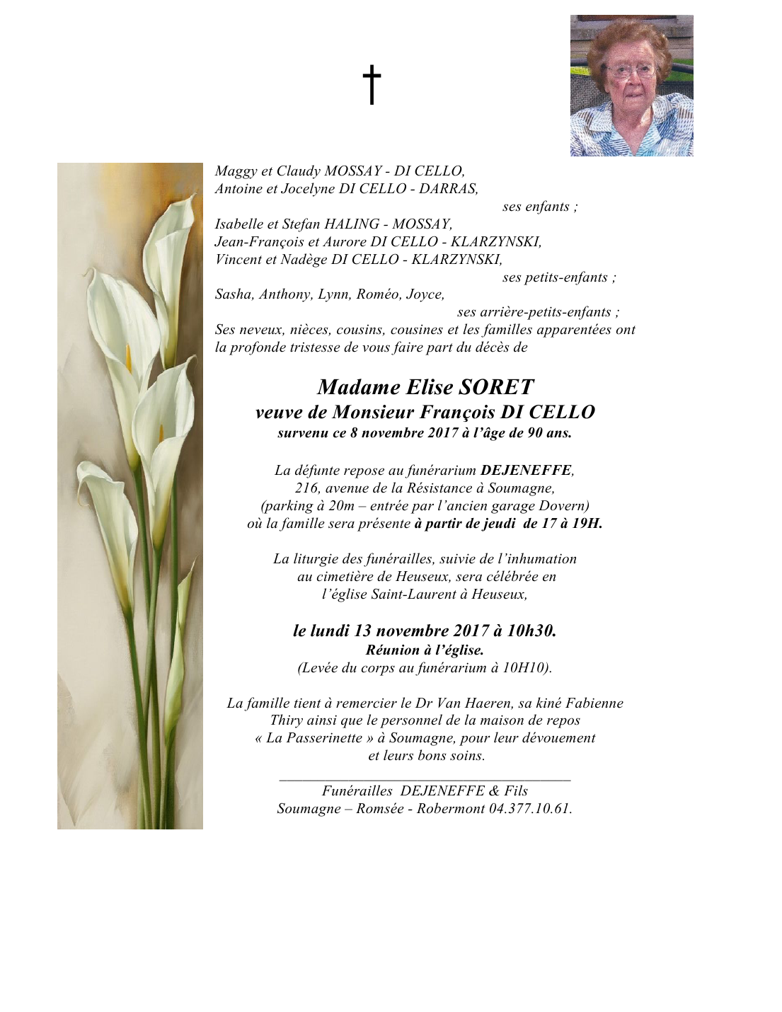 Décédée à Soumagne (4630) le mercredi 8 novembre 2017 à l'âge de 90 ans