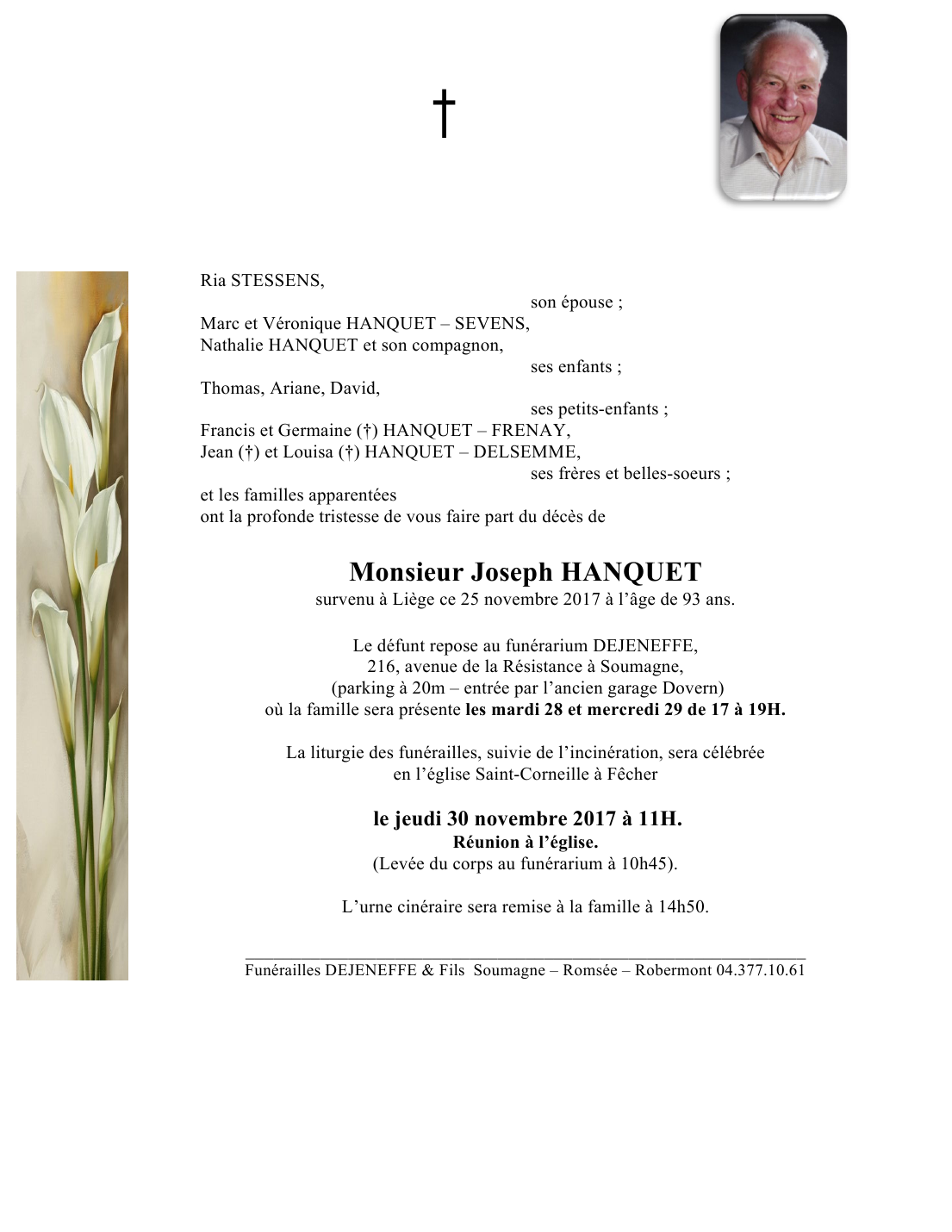 Décédé à Liège (4000) le samedi 25 novembre 2017 à l'âge de 93 ans