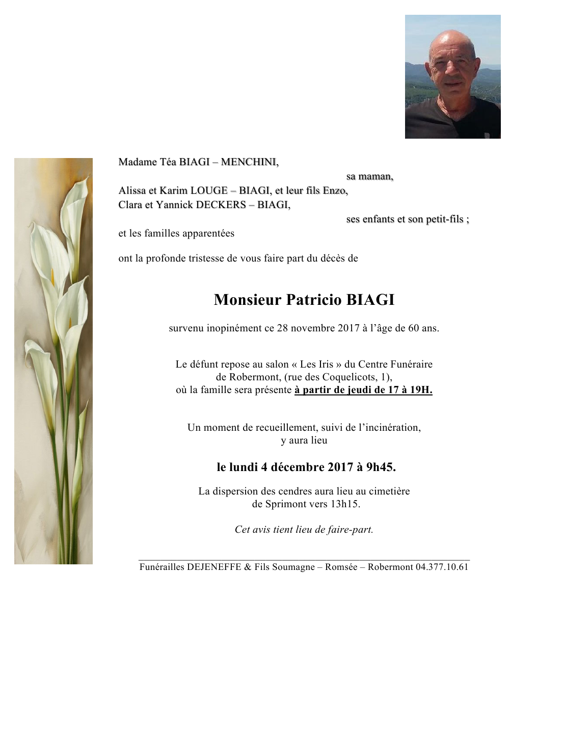 Décédé à Chênée (4032) le mardi 28 novembre 2017 à l'âge de 60 ans