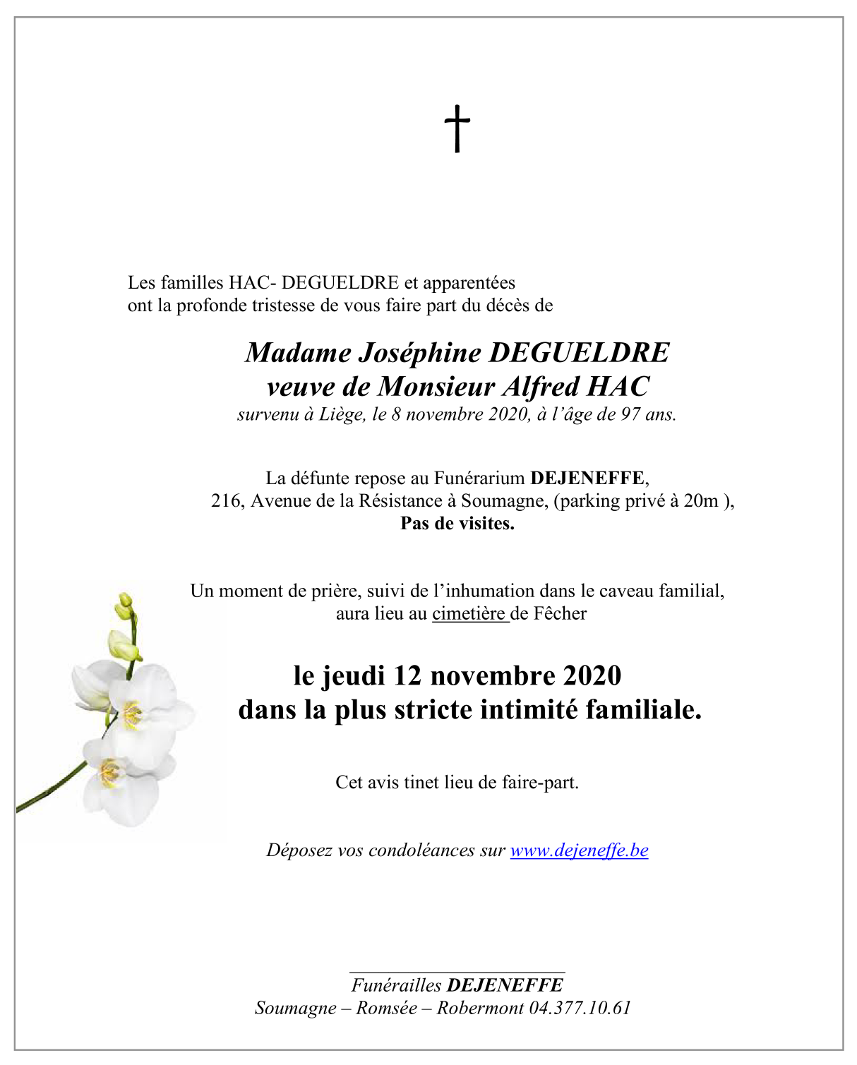 Décédée à Liège (4000) le dimanche 8 novembre 2020 à l'âge de 97 ans