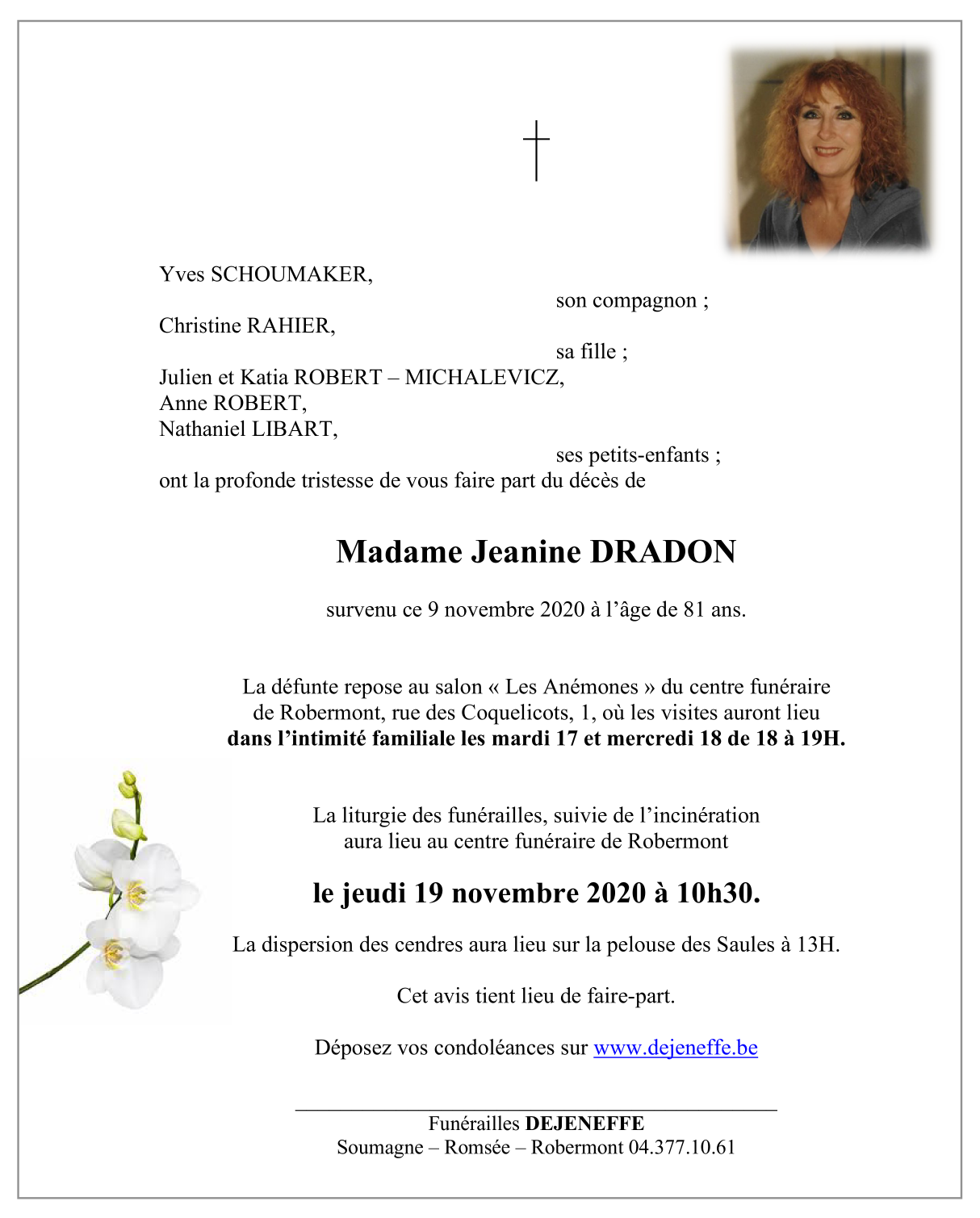 Décédée à Liège (4000) le lundi 9 novembre 2020 à l'âge de 81 ans