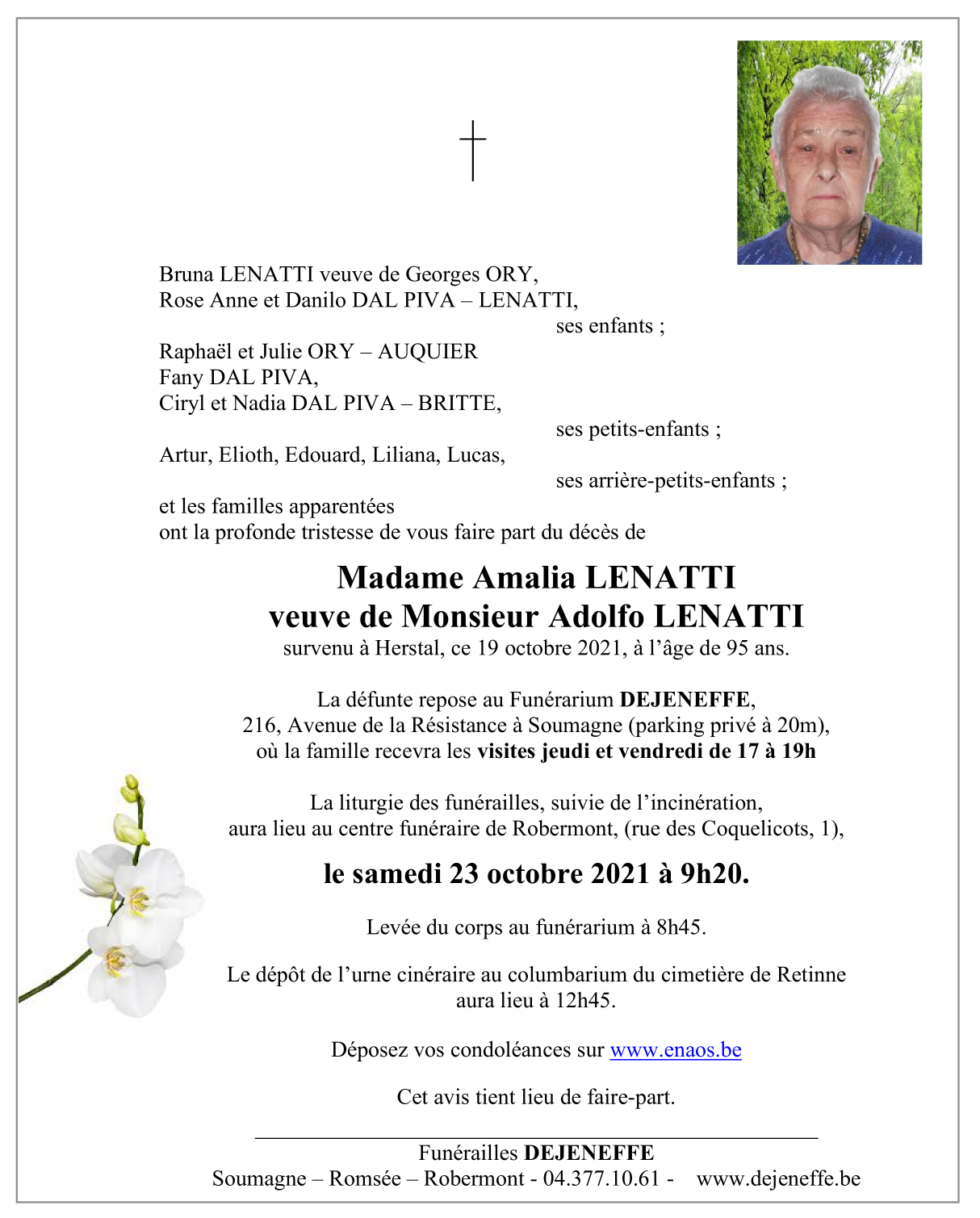 Décédée à Herstal (4040) le mardi 19 octobre 2021 à l'âge de 95 ans