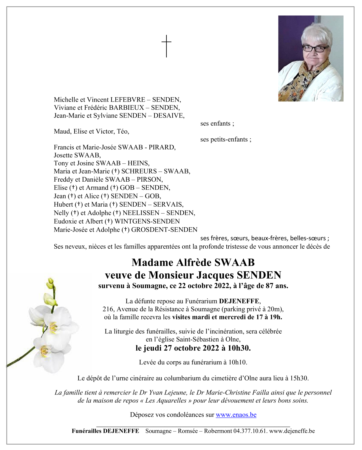 Décédée à Soumagne (4630) le samedi 22 octobre 2022 à l'âge de 87 ans