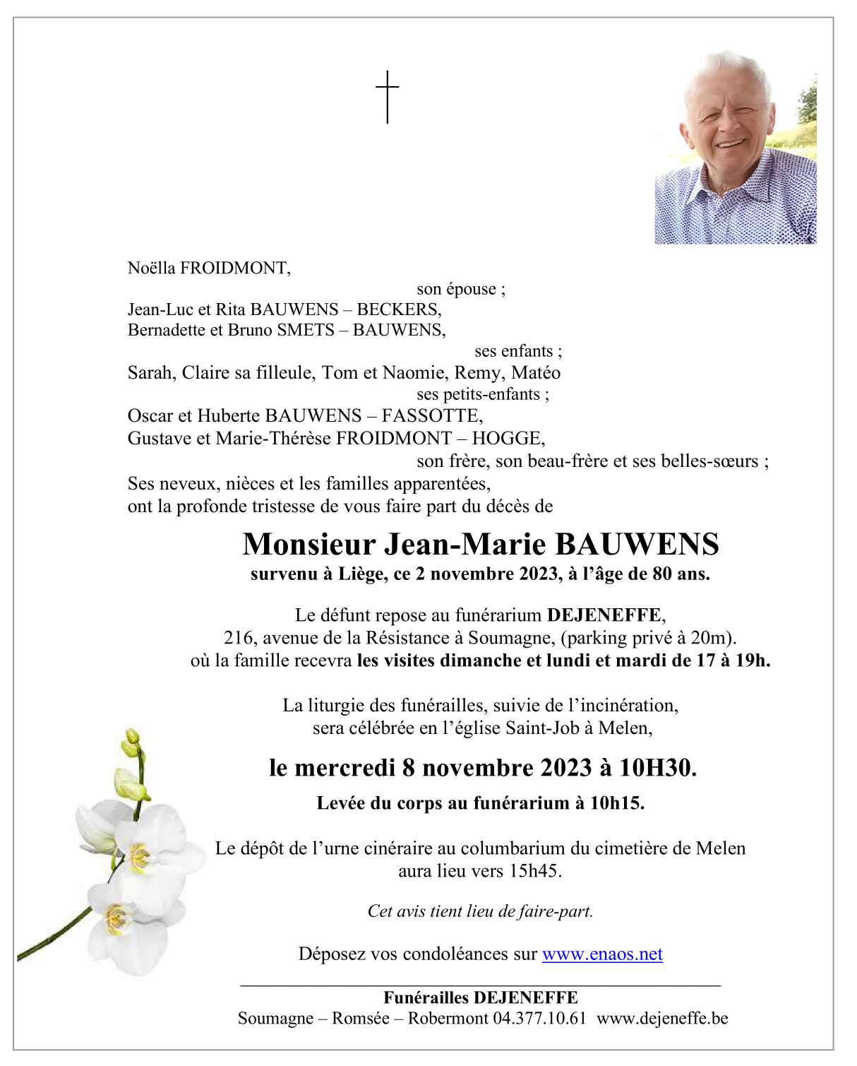 Décédé à Liège (4000) le jeudi 2 novembre 2023 à l'âge de 80 ans