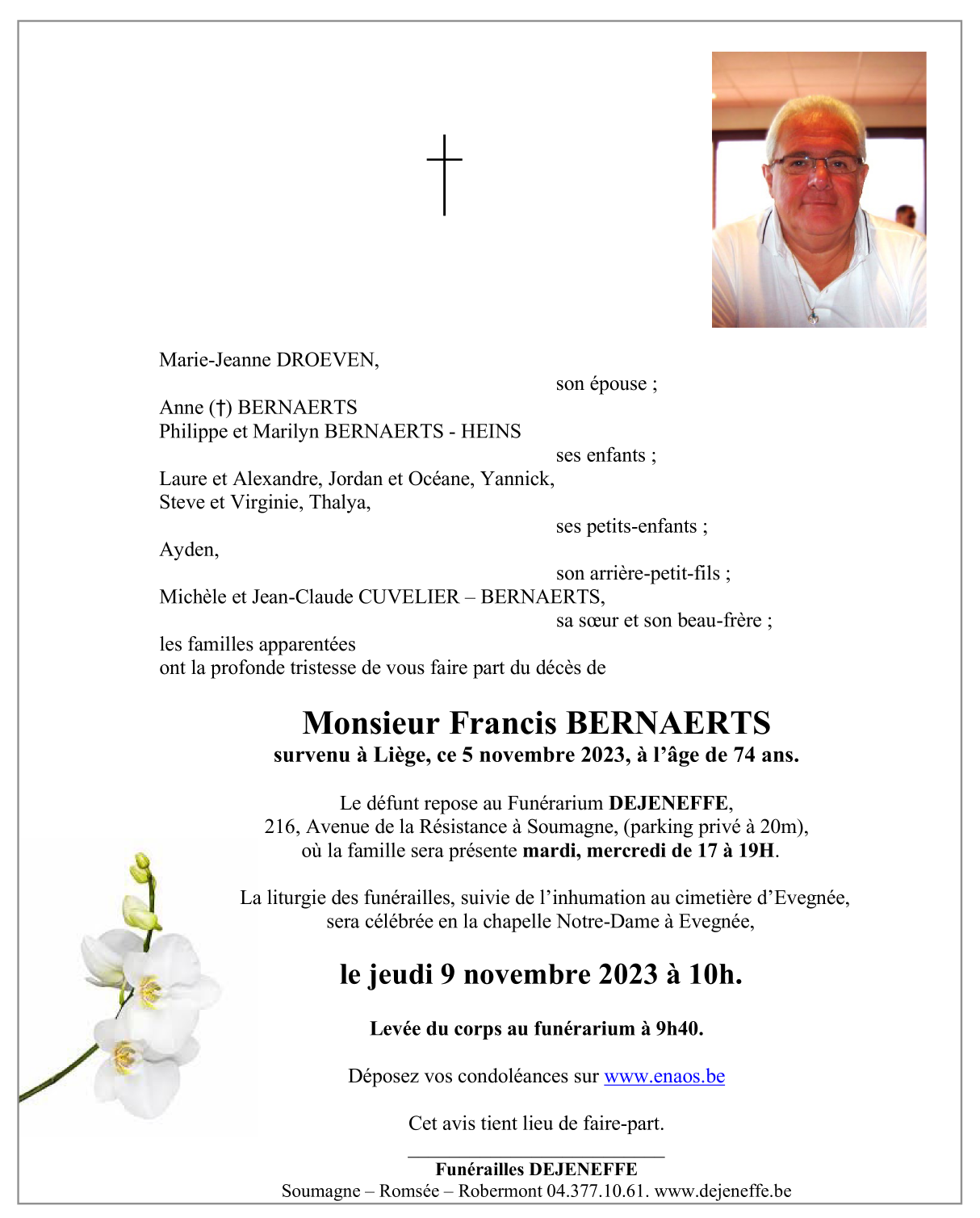 Décédé à Liège (4000) le dimanche 5 novembre 2023 à l'âge de 74 ans