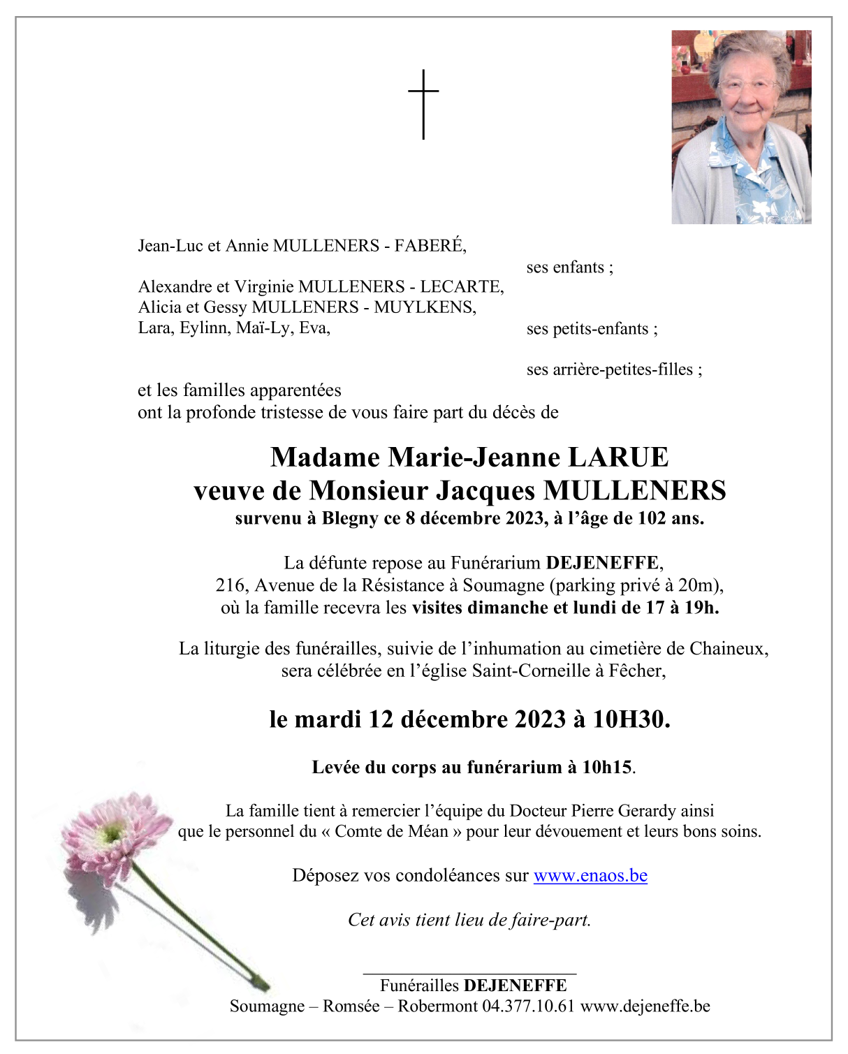 Décédée à Blegny (4670) le vendredi 8 décembre 2023 à l'âge de 102 ans