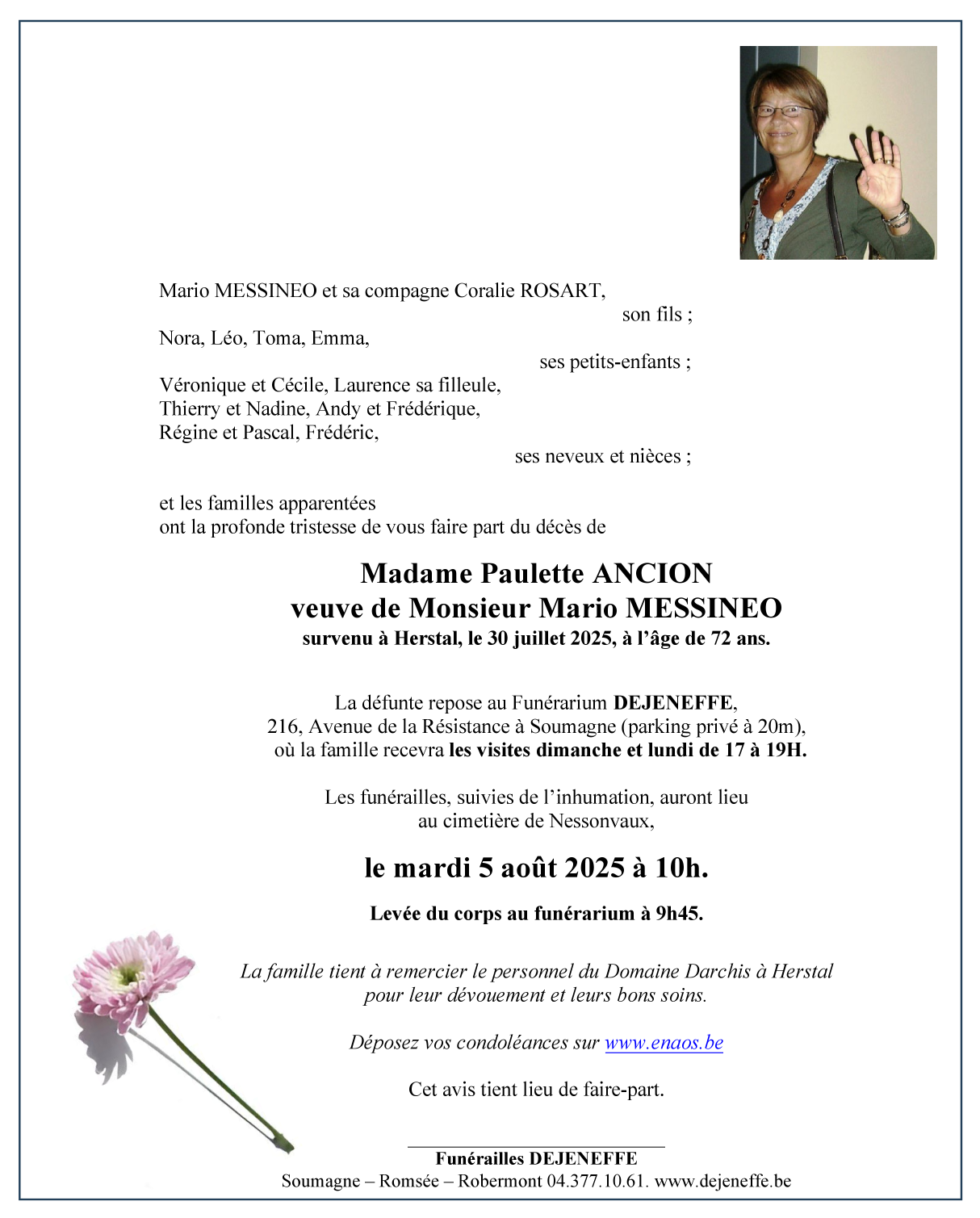 Décédée à Herstal (4040) le mercredi 30 juillet 2025 à l'âge de 72 ans
