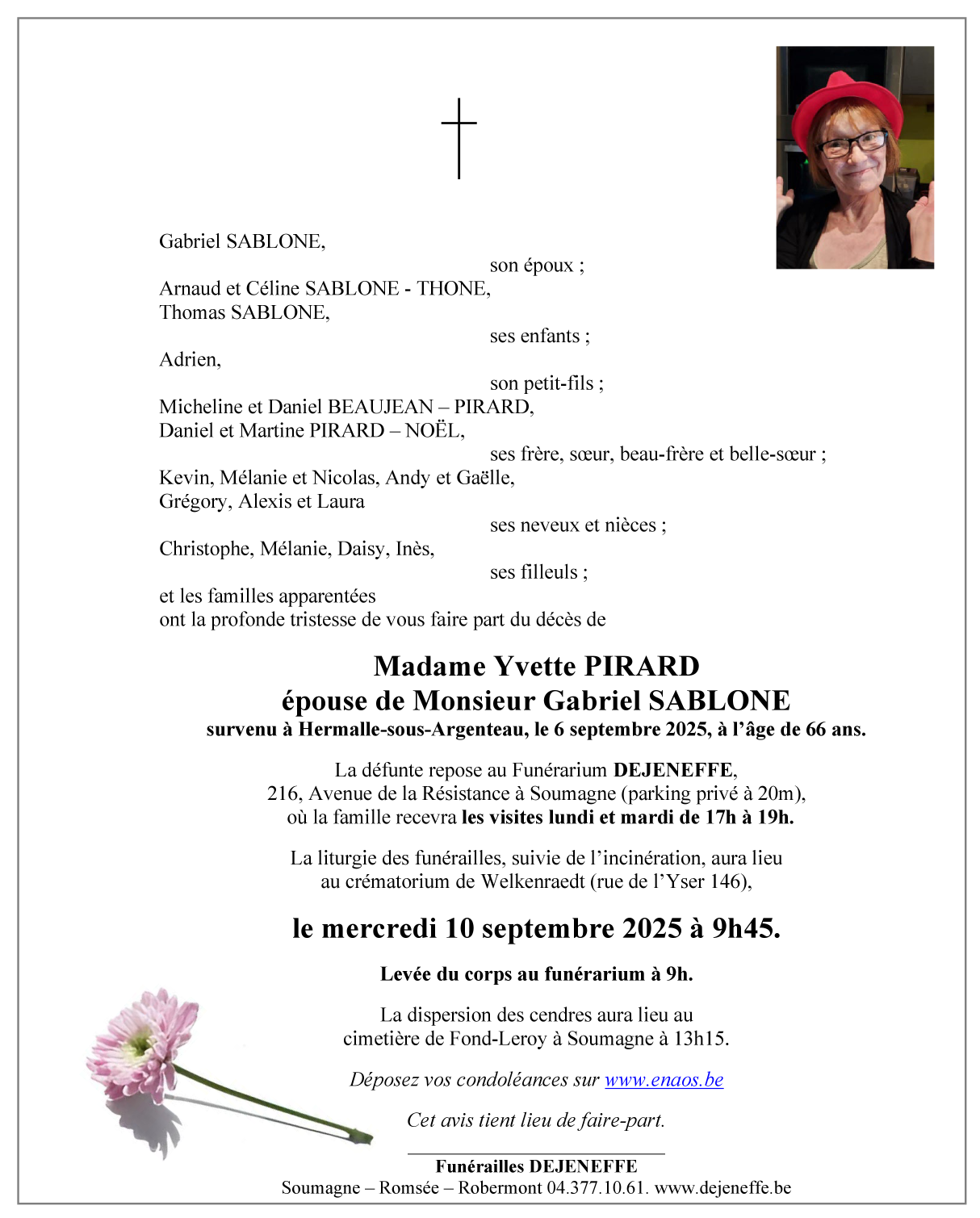 Décédée à Oupeye (4680) le samedi 6 septembre 2025 à l'âge de 66 ans