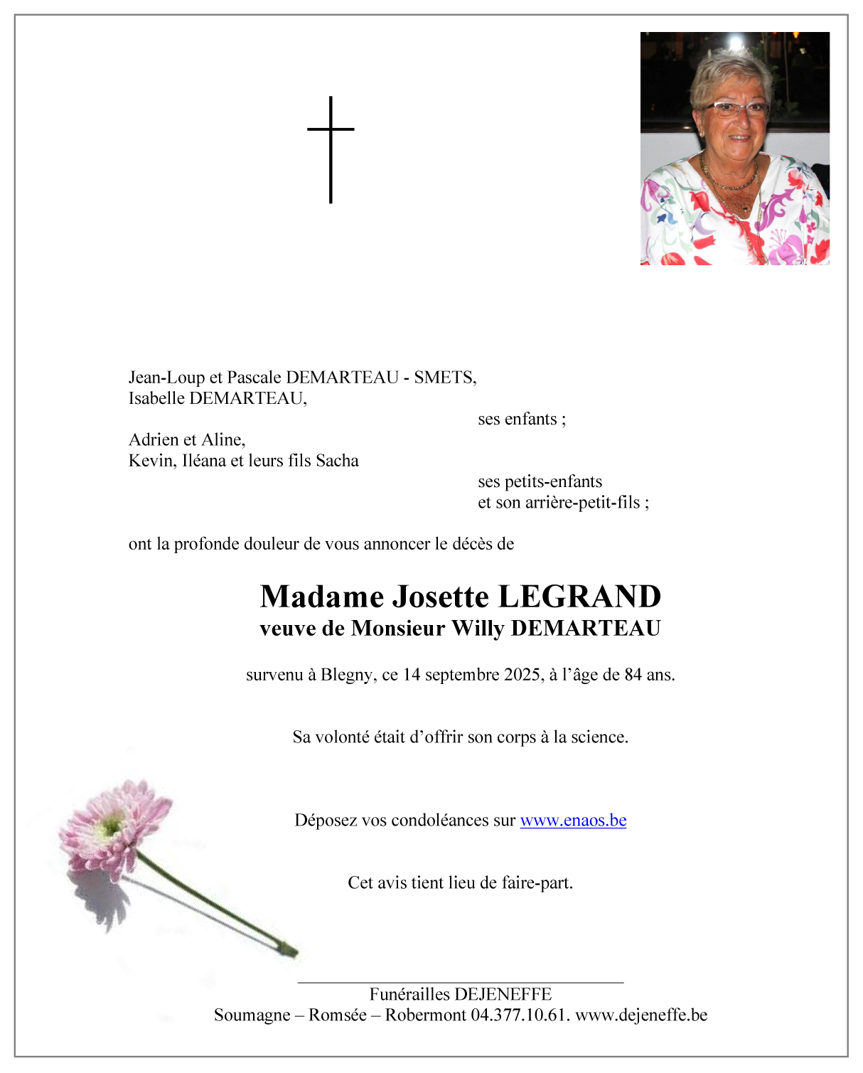 Décédée à Blegny (4670) le dimanche 14 septembre 2025 à l'âge de 84 ans