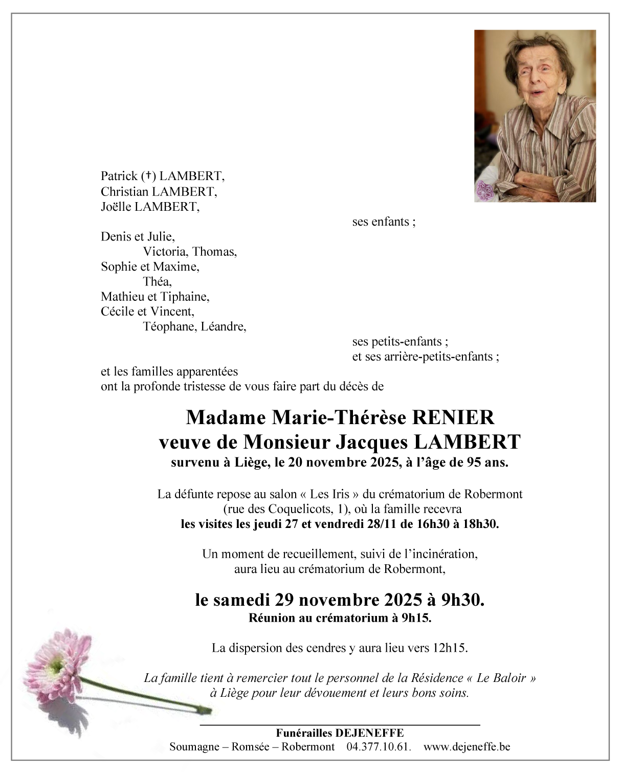 Décédée à Liège (4000) le jeudi 20 novembre 2025 à l'âge de 95 ans