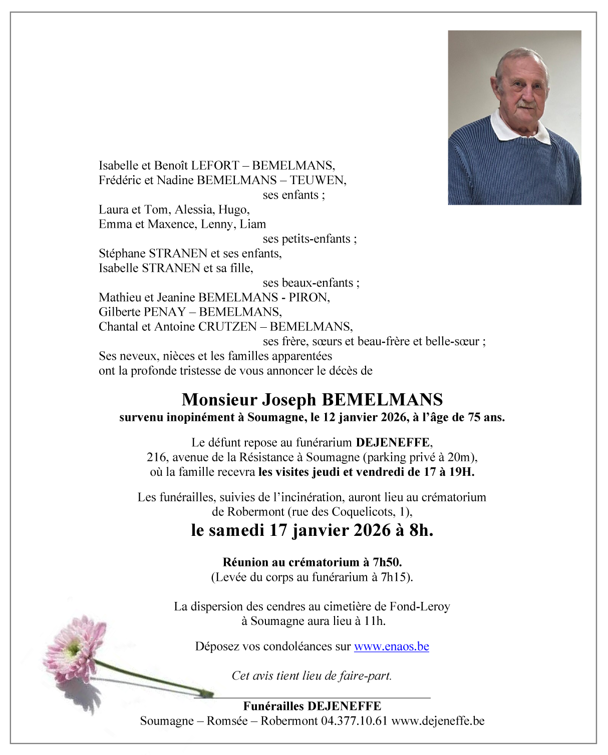 Décédé à Melen (4633) le lundi 12 janvier 2026 à l'âge de 75 ans
