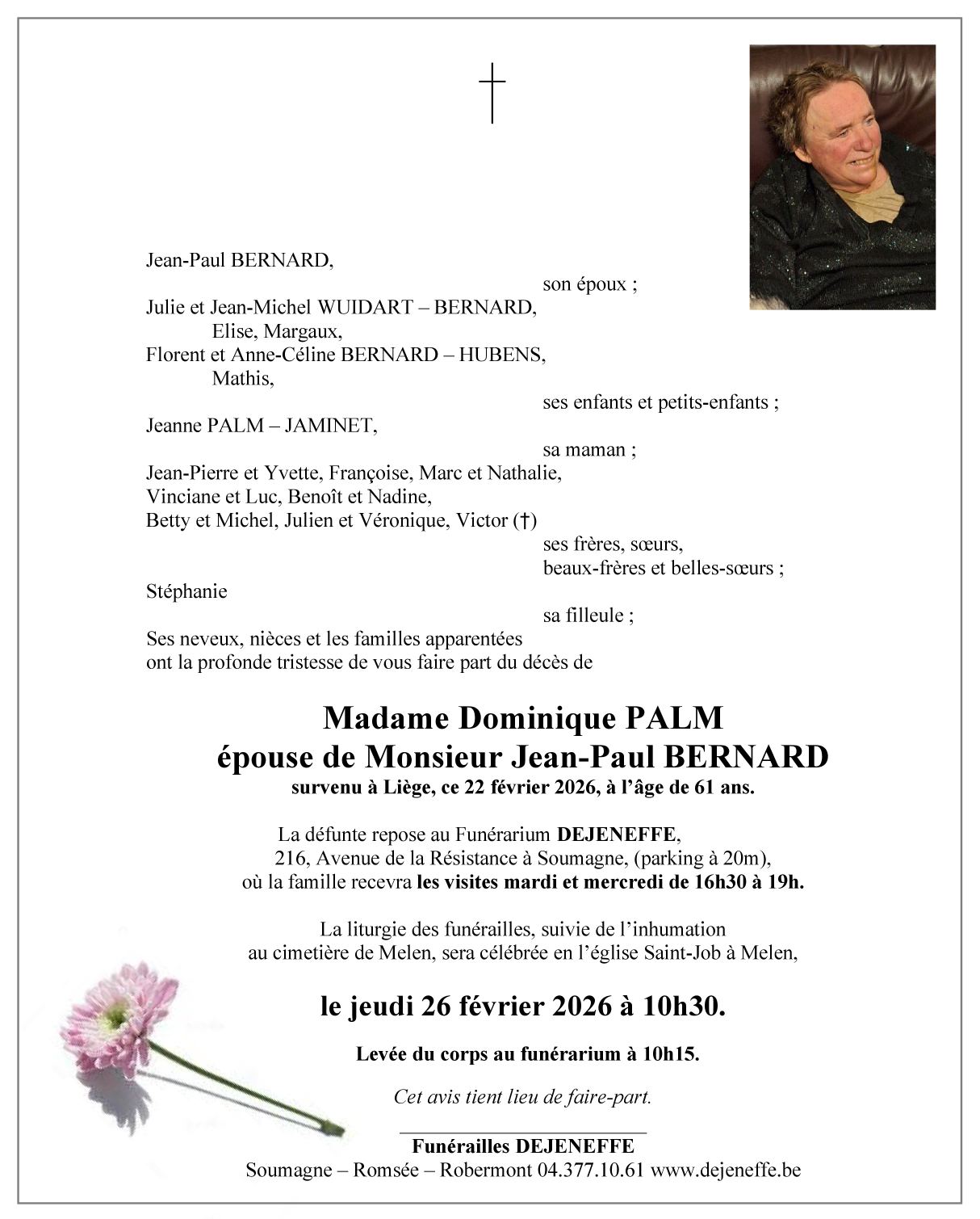 Décédée à Liège (4000) le dimanche 22 février 2026 à l'âge de 61 ans