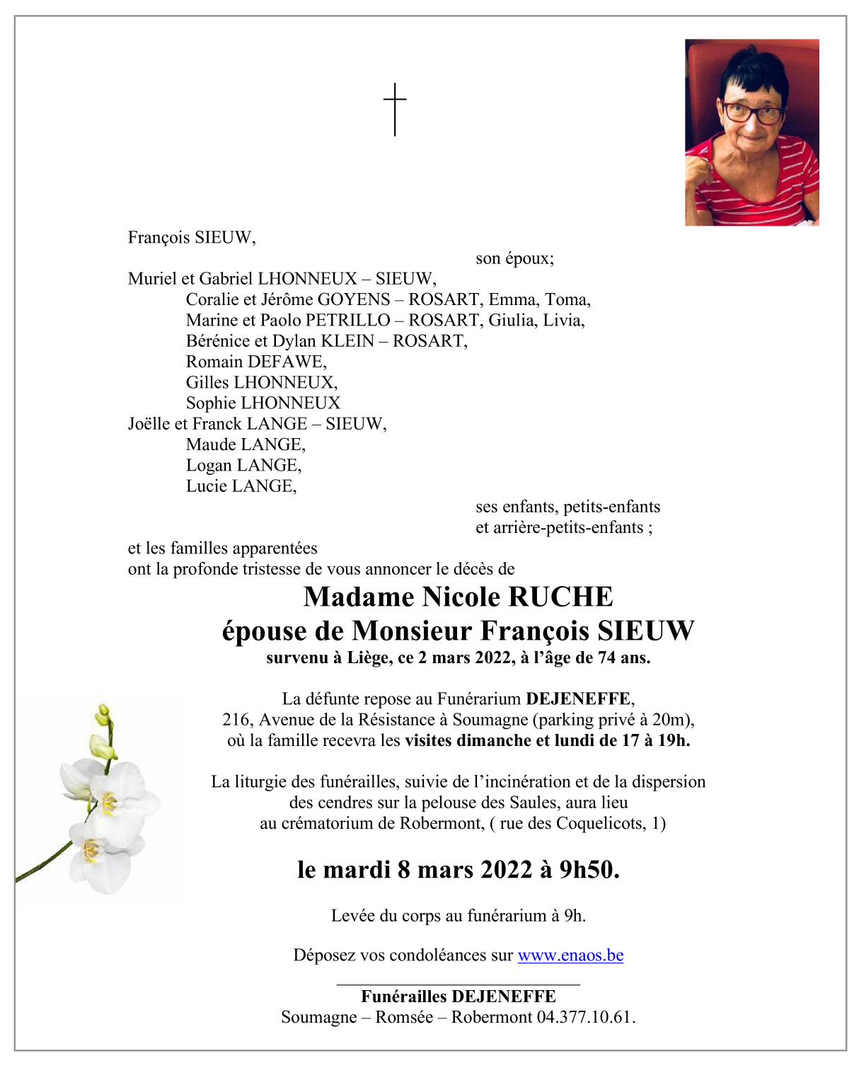 Décédée à Liège (4000) le mercredi 2 mars 2022 à l'âge de 74 ans
