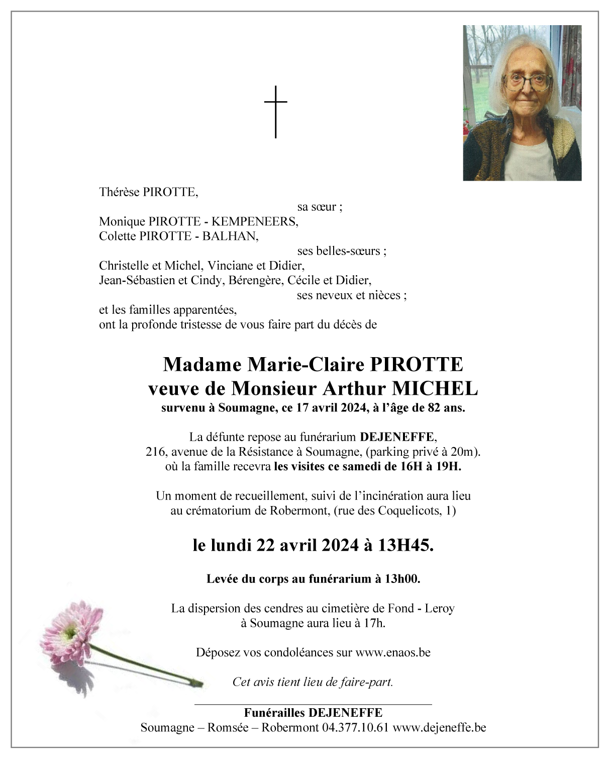 Décédée à Soumagne (4630) le mercredi 17 avril 2024 à l'âge de 82 ans