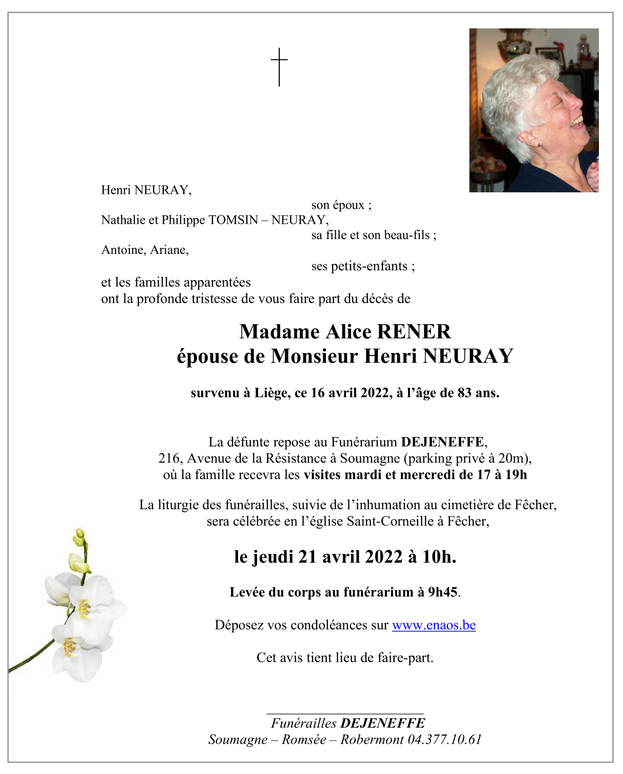 Décédée à Liège (4000) le samedi 16 avril 2022 à l'âge de 83 ans