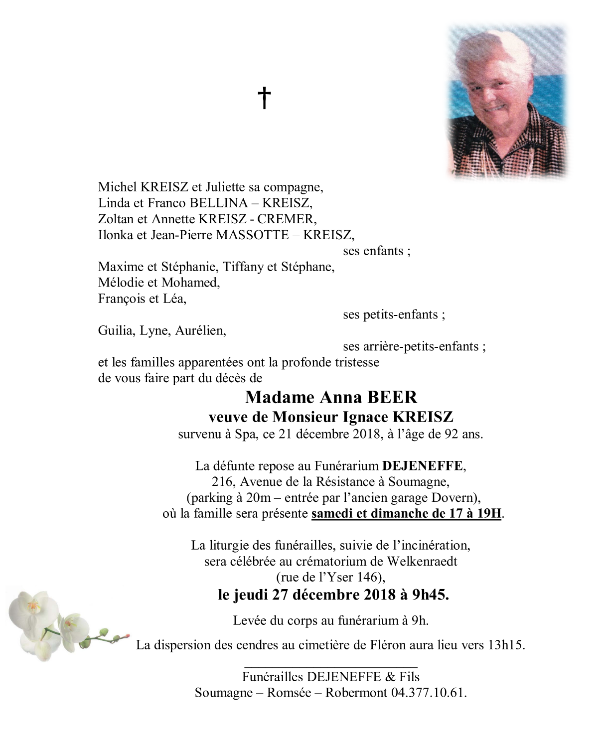 Décédée à Spa (4900) le vendredi 21 décembre 2018 à l'âge de 92 ans