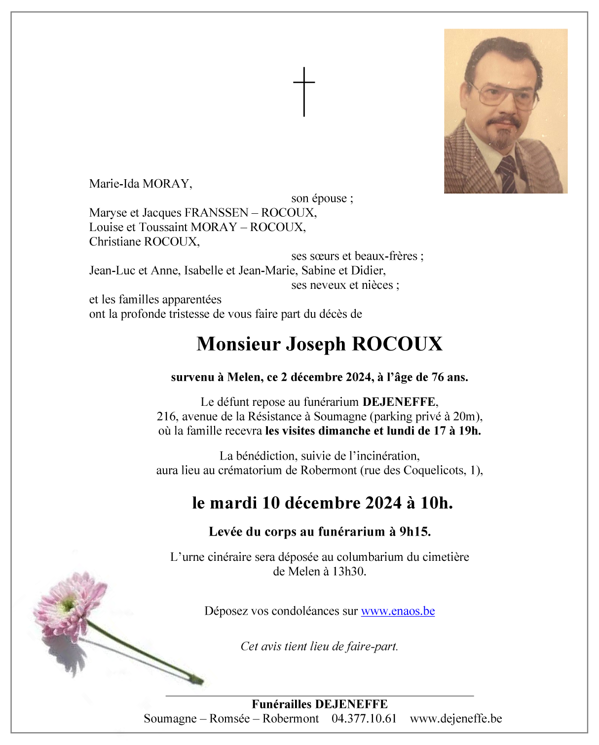 Décédé à Melen (4633) le lundi 2 décembre 2024 à l'âge de 76 ans
