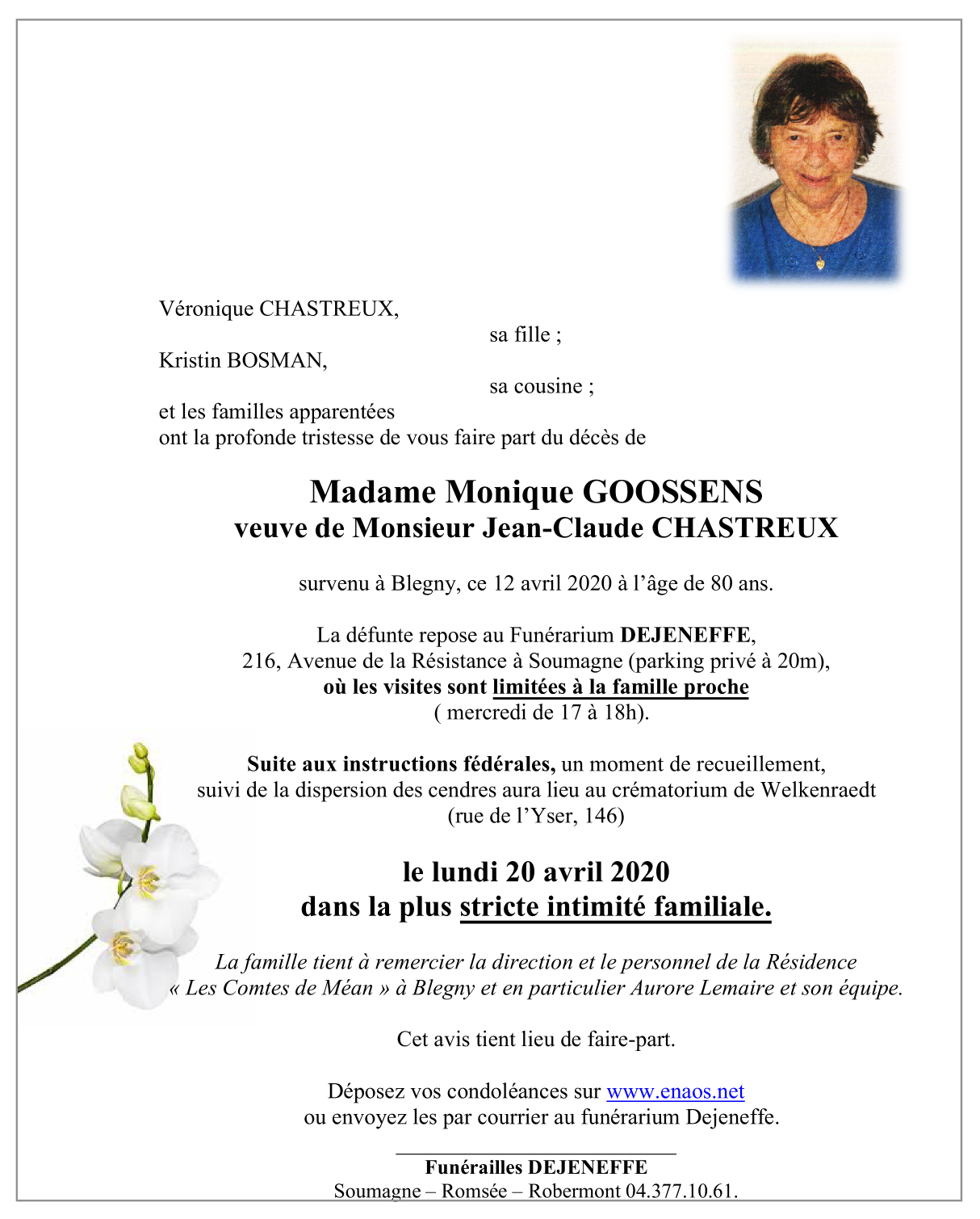 Veuve de Monsieur Jean-Claude CHASTREUX
