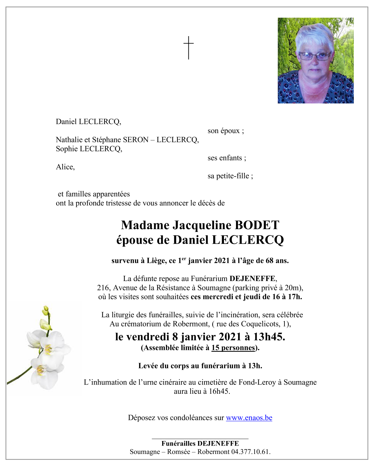Décédée à Liège (4000) le vendredi 1 janvier 2021 à l'âge de 68 ans