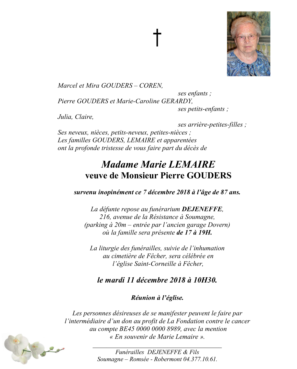 Décédée à Soumagne (4630) le vendredi 7 décembre 2018 à l'âge de 87 ans
