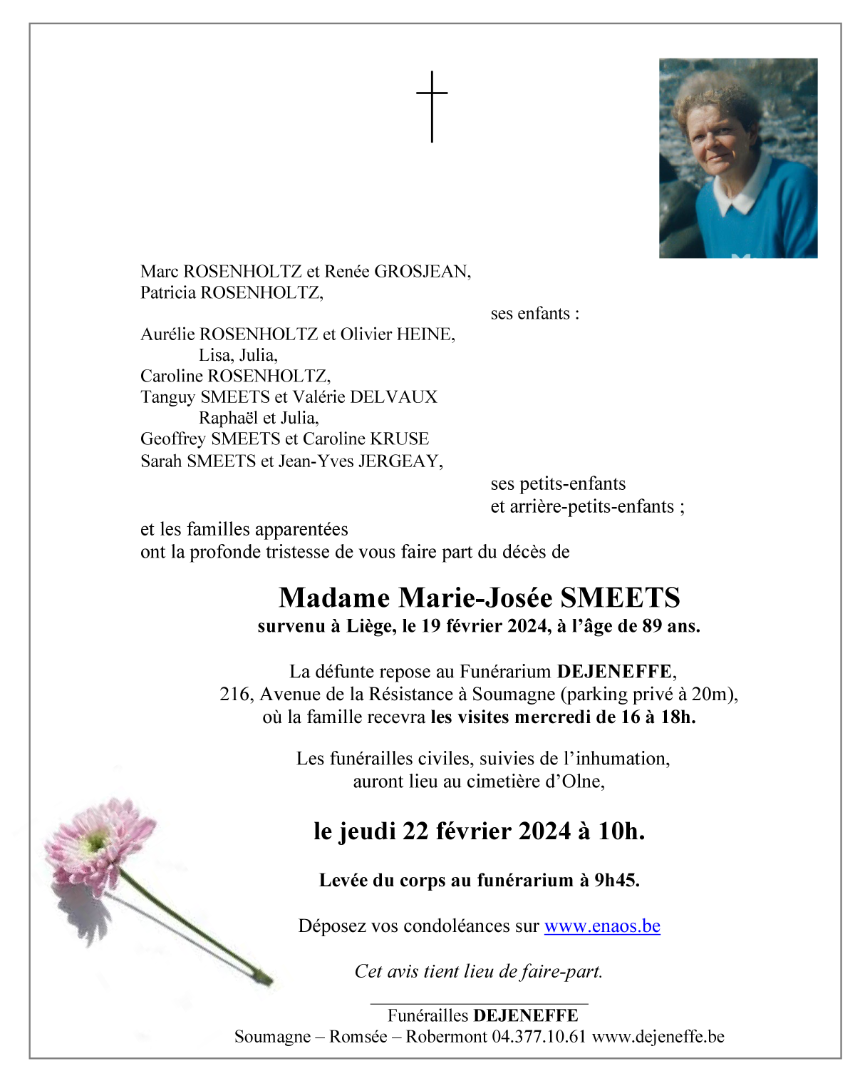 Décédée à Liège (4030) le lundi 19 février 2024 à l'âge de 89 ans