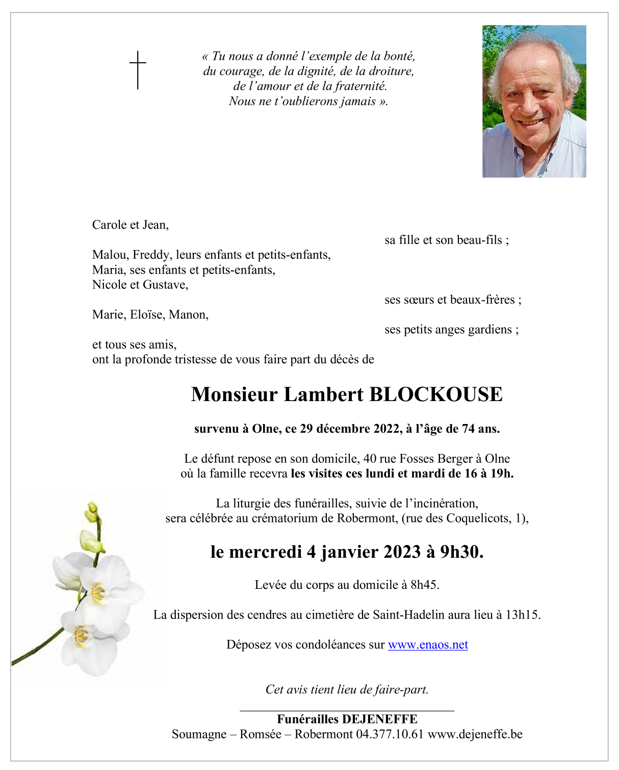 Décédé à Saint-Hadelin (4877) le jeudi 29 décembre 2022 à l'âge de 74 ans