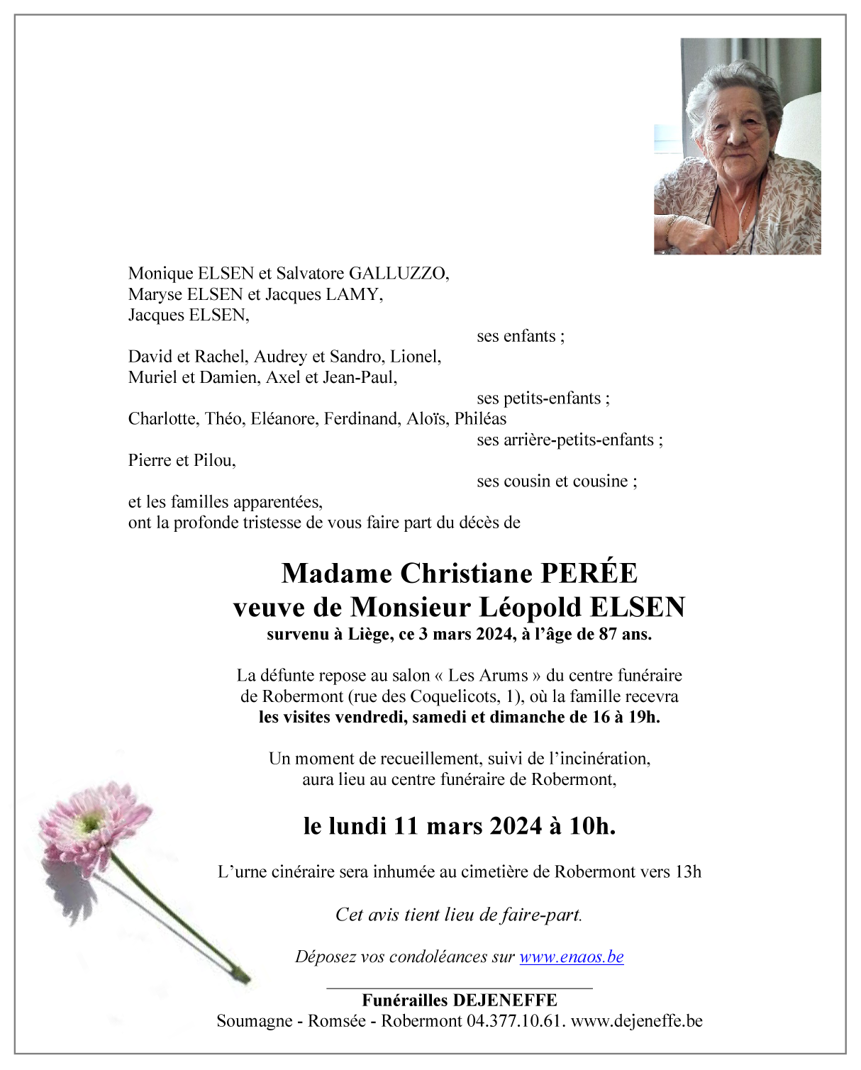 Décédée à Liège (4000) le dimanche 3 mars 2024 à l'âge de 87 ans