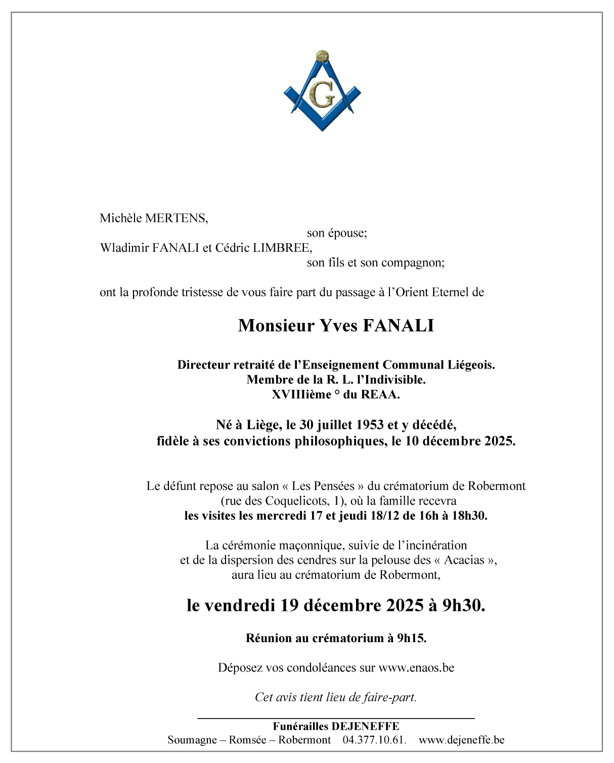 Décédé à Liège (4000) le mercredi 10 décembre 2025 à l'âge de 72 ans