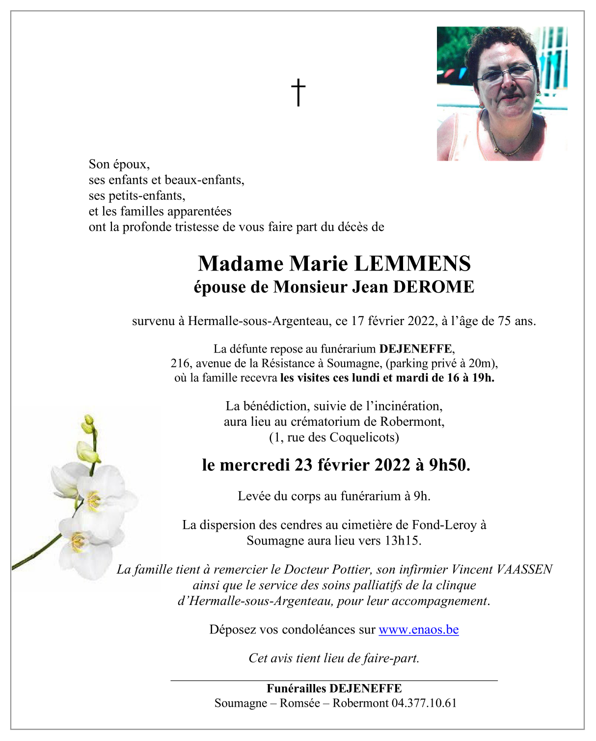 Décédée à Hermalle-sous-Argenteau (4681) le jeudi 17 février 2022 à l'âge de 75 ans
