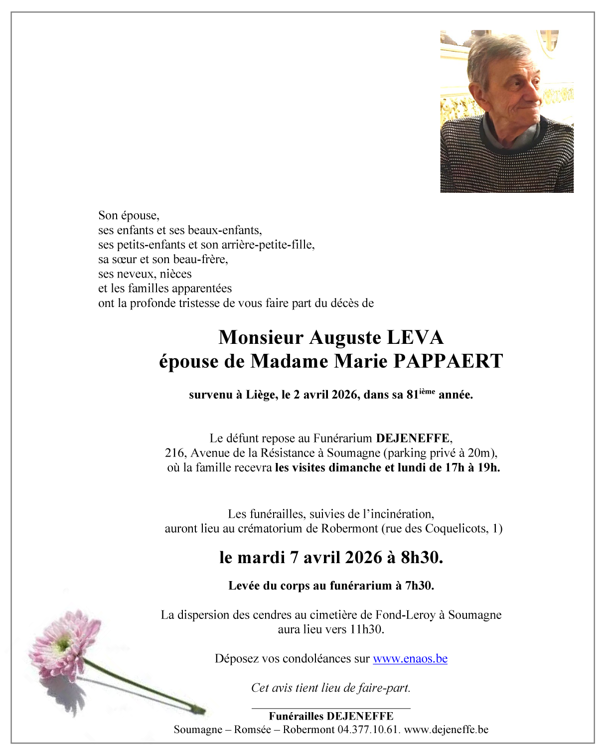 Décédé à Liège (4000) le jeudi 2 avril 2026 à l'âge de 80 ans