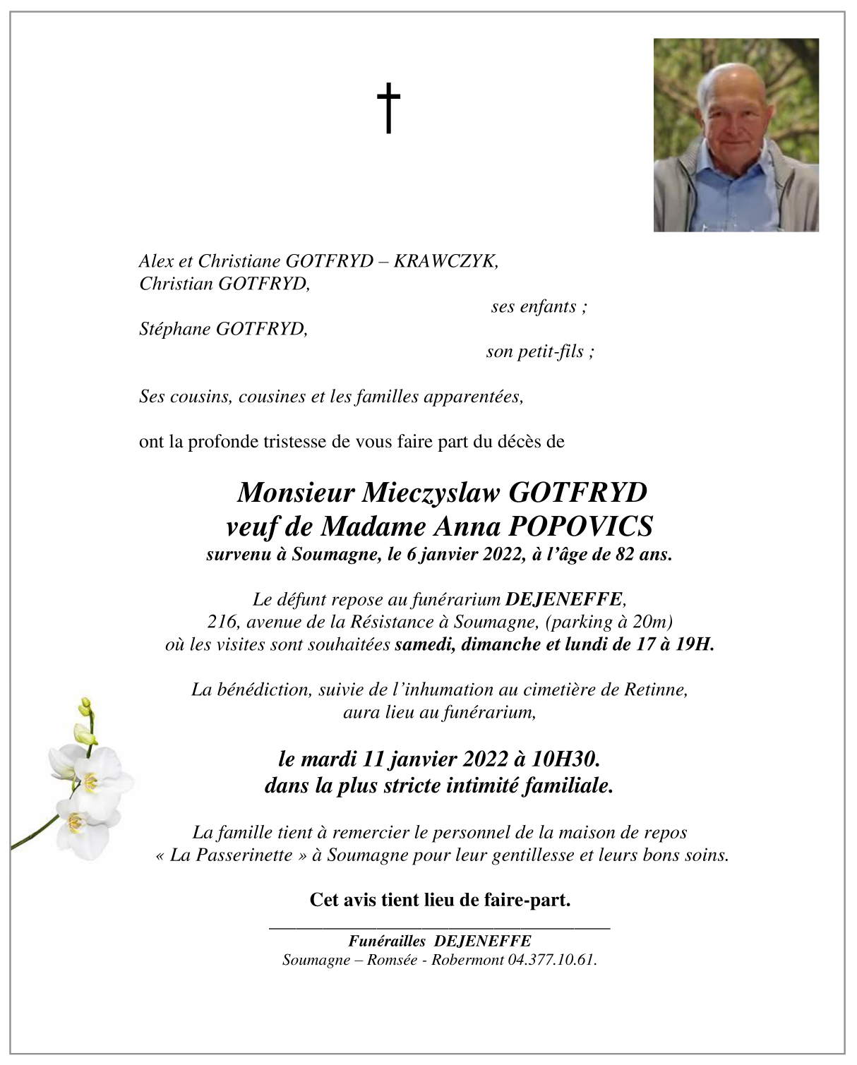 Décédé à Soumagne (4630) le jeudi 6 janvier 2022 à l'âge de 82 ans