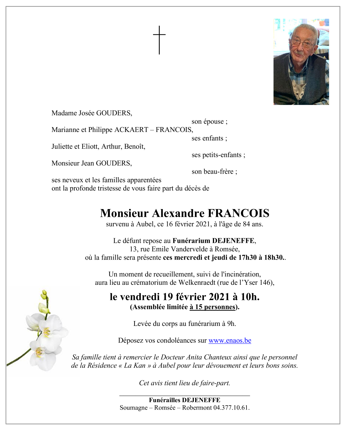 Décédé à Aubel (4880) le mardi 16 février 2021 à l'âge de 84 ans