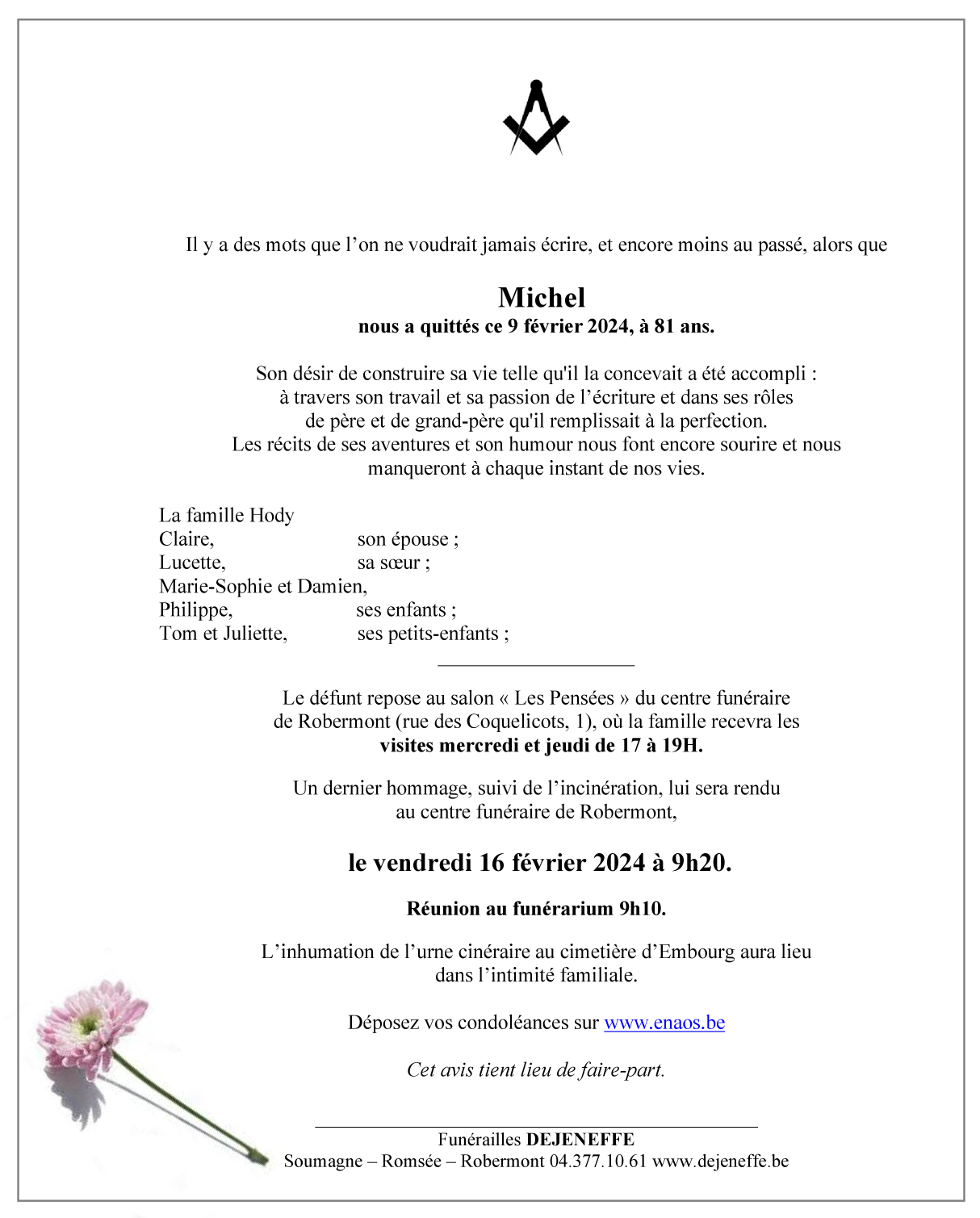 Décédé à Embourg (4053) le vendredi 9 février 2024 à l'âge de 81 ans