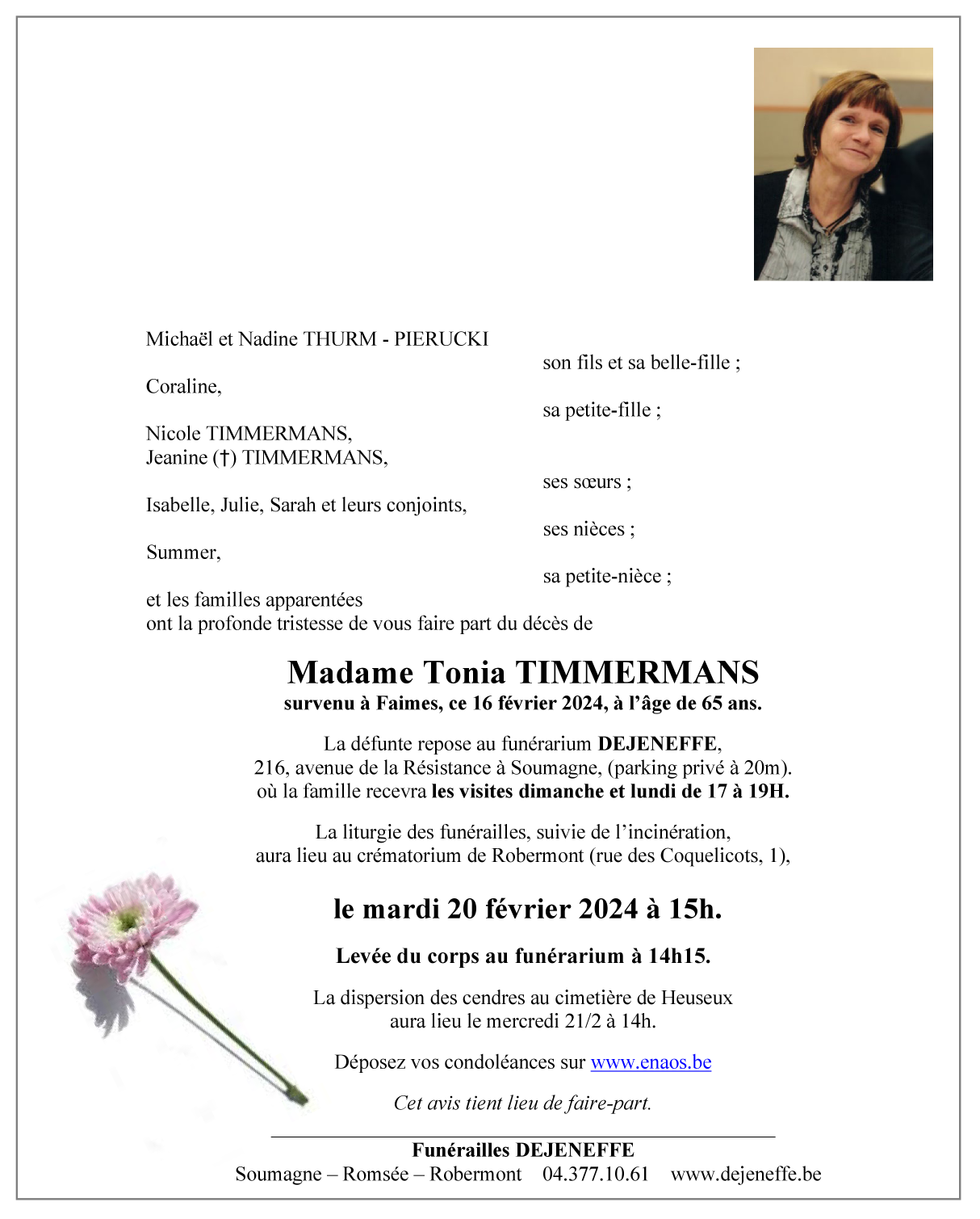 Décédée à Faimes (4317) le vendredi 16 février 2024 à l'âge de 65 ans
