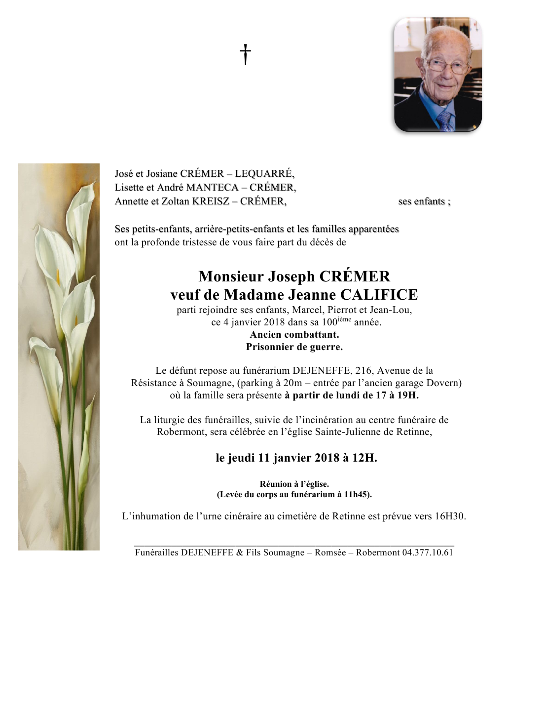 Décédé à Fléron (4620) le jeudi 4 janvier 2018 à l'âge de 99 ans
