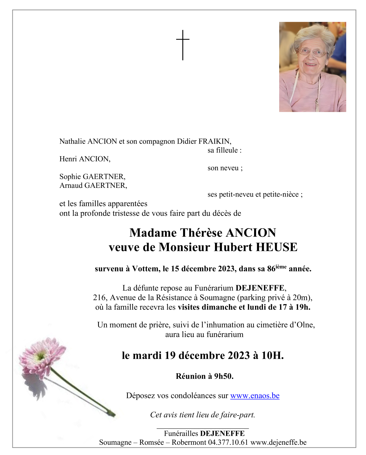 Décédée à Vottem (4041) le vendredi 15 décembre 2023 à l'âge de 85 ans