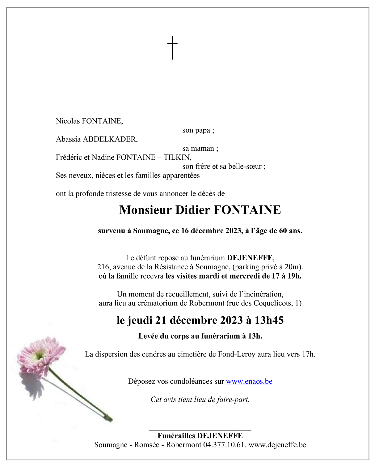 Décédé à Soumagne (4630) le samedi 16 décembre 2023 à l'âge de 60 ans