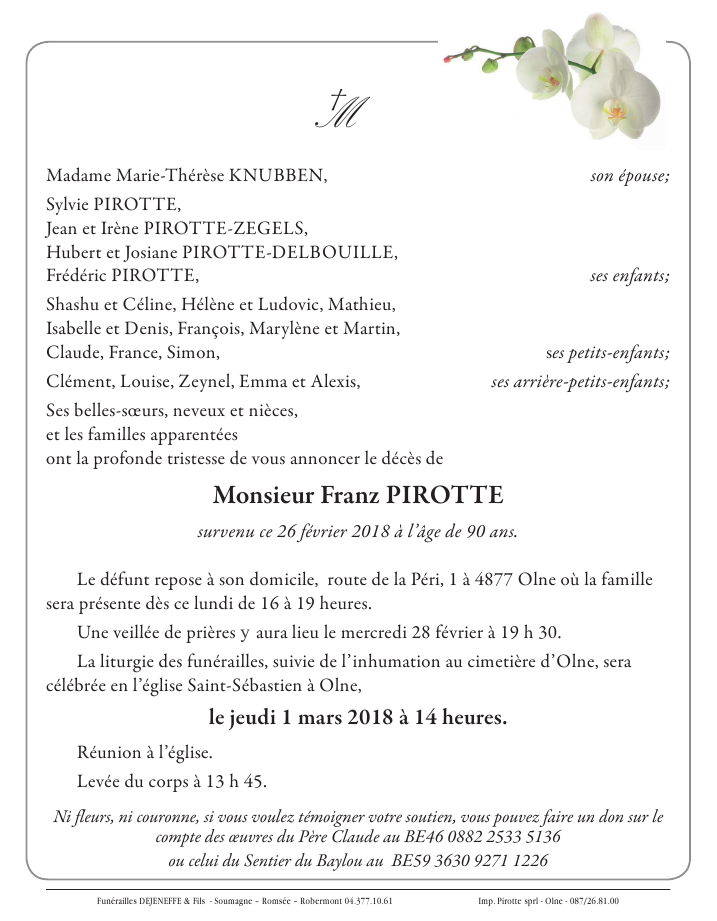 Décédé à Olne (4877) le lundi 26 février 2018 à l'âge de 90 ans