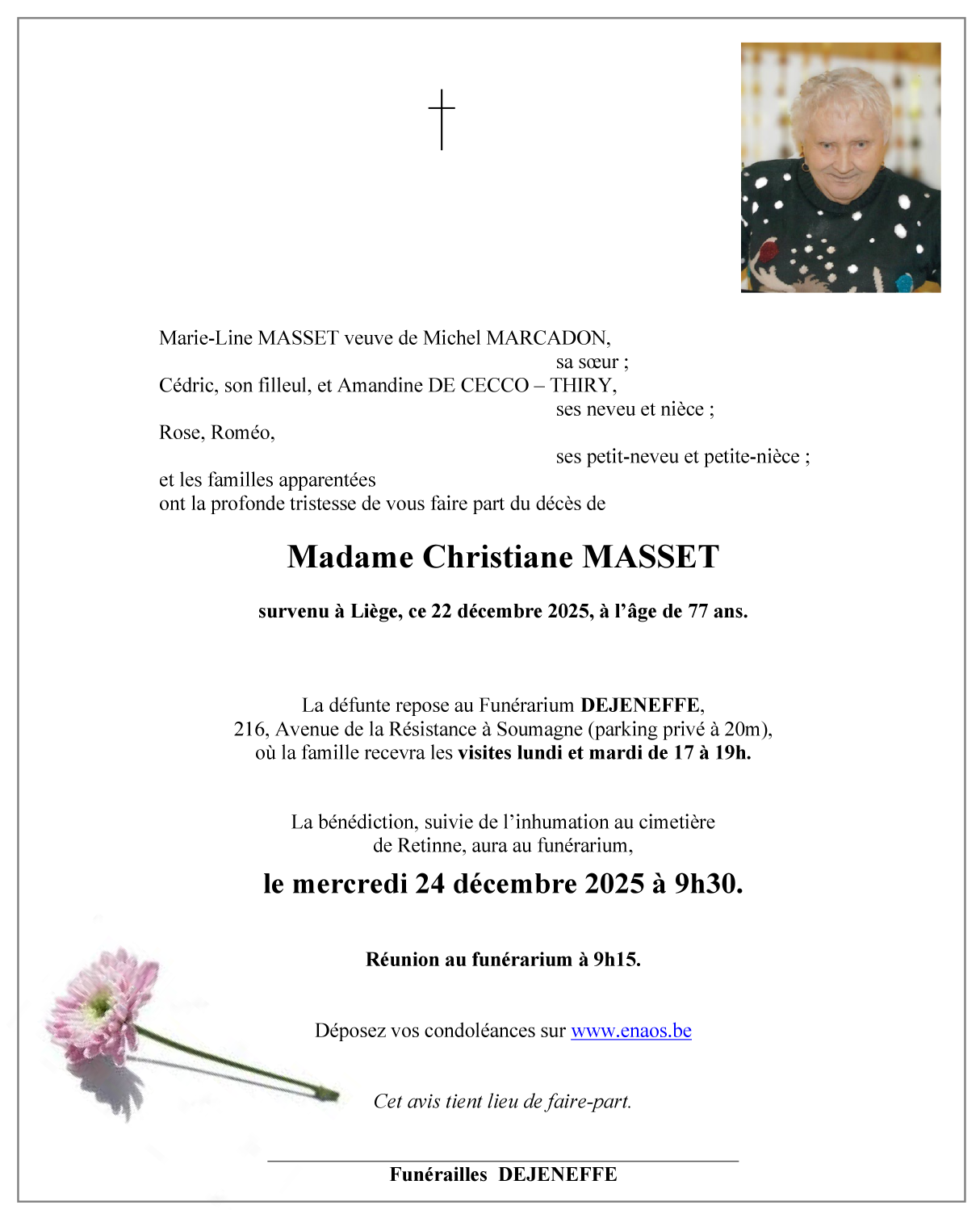Décédée à Liège (4000) le lundi 22 décembre 2025 à l'âge de 77 ans