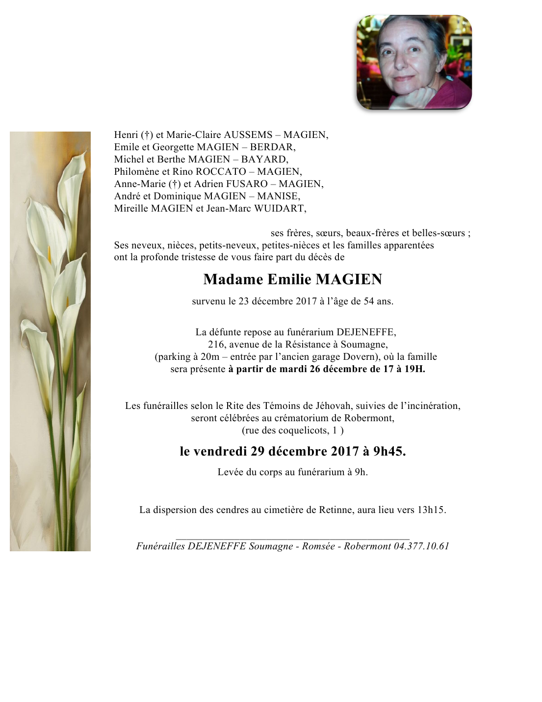 Décédée à Liège (4000) le samedi 23 décembre 2017 à l'âge de 54 ans