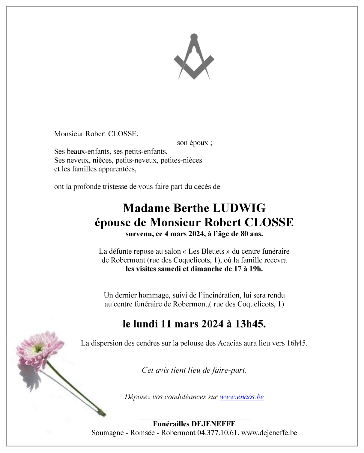 Décédée à Flémalle (4400) le lundi 4 mars 2024 à l'âge de 80 ans