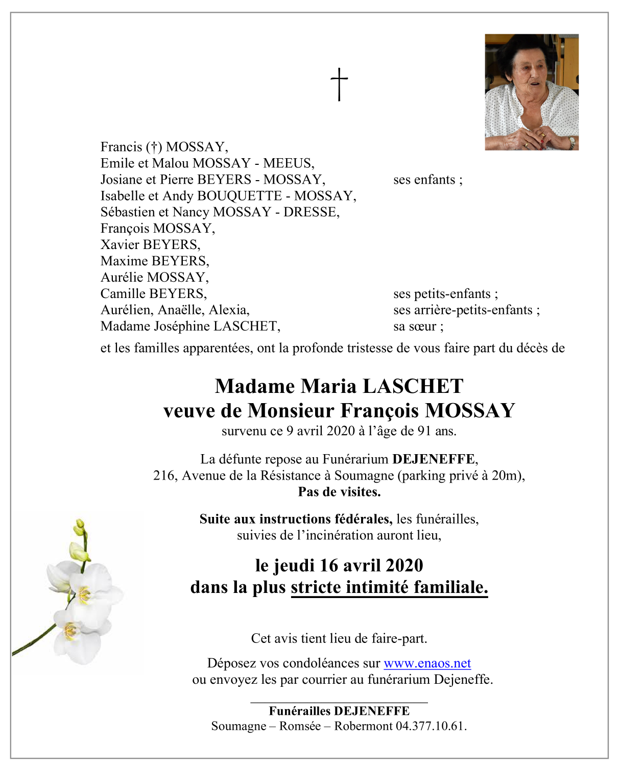 Décédée à Theux (4910) le jeudi 9 avril 2020 à l'âge de 91 ans