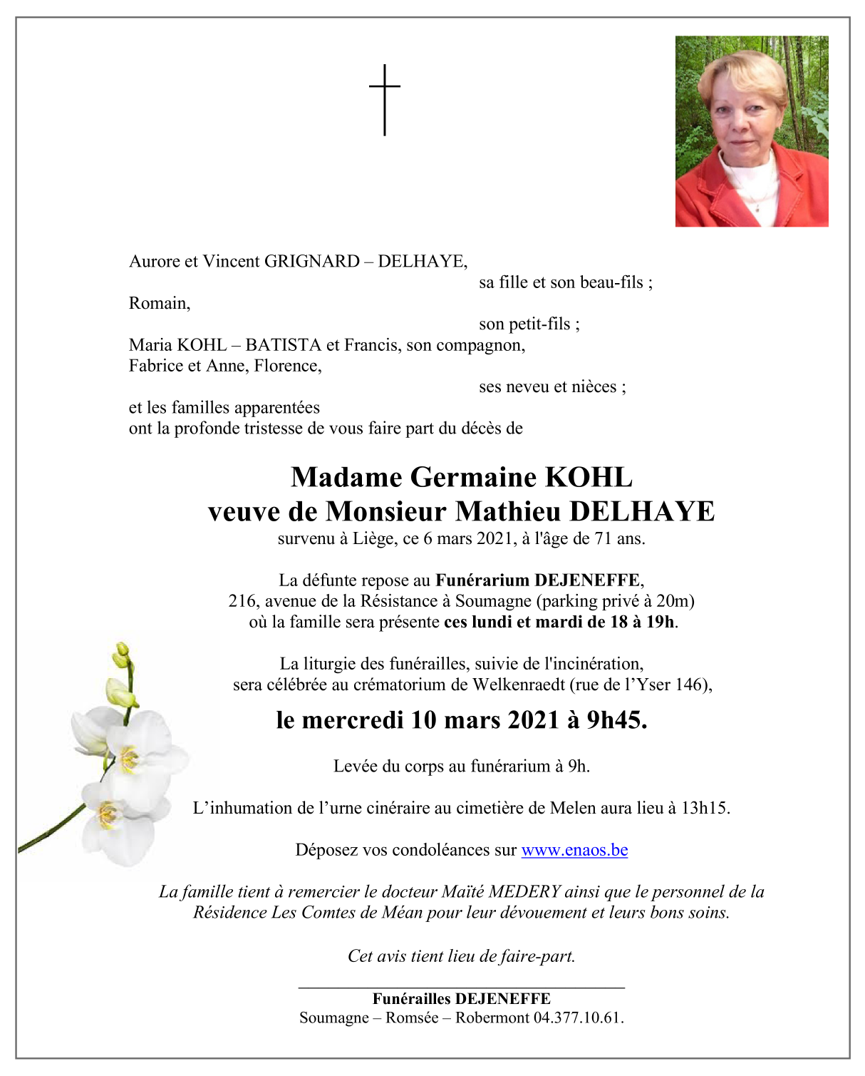 Décédée à Liège (4000) le samedi 6 mars 2021 à l'âge de 71 ans