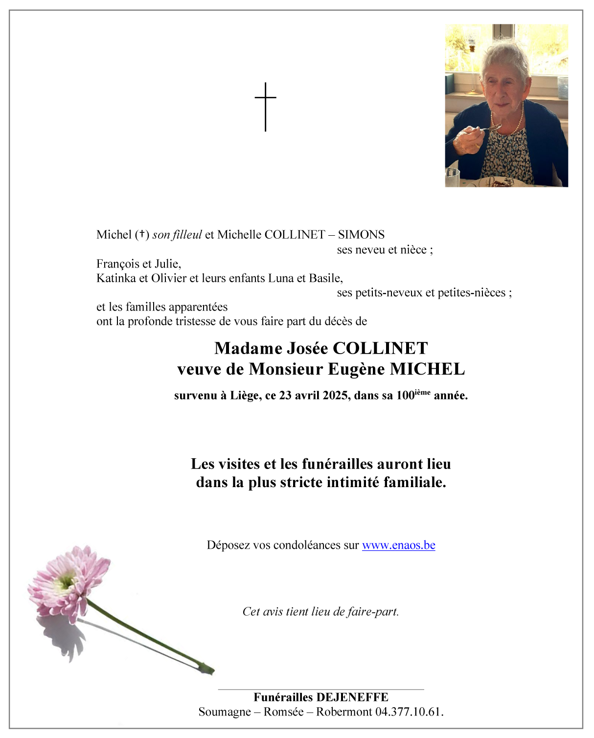 Décédée à Liège (4000) le mercredi 23 avril 2025 à l'âge de 99 ans