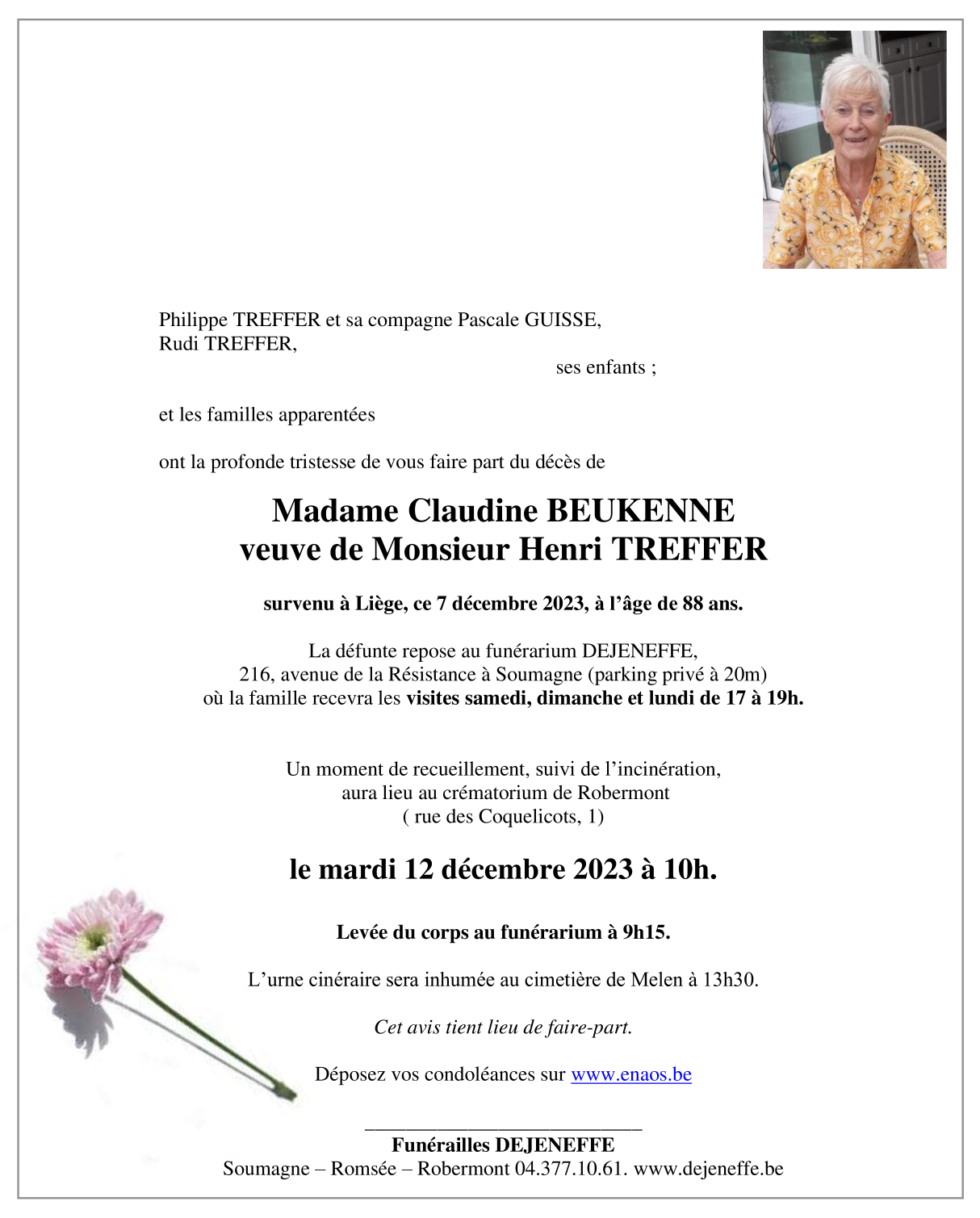 Décédée à Liège (4000) le jeudi 7 décembre 2023 à l'âge de 88 ans