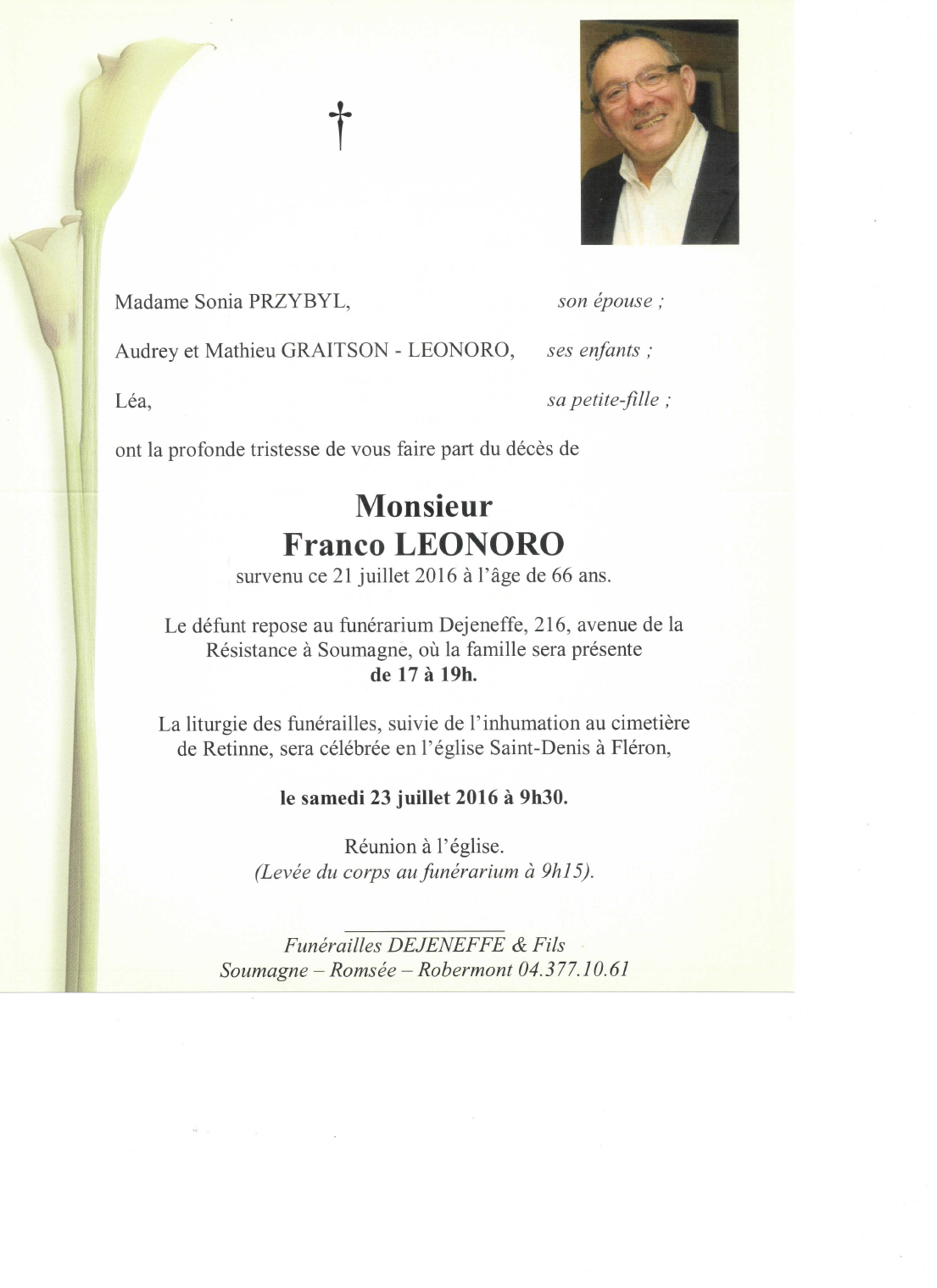 Décédé à Retinne (4621) le jeudi 21 juillet 2016 à l'âge de 66 ans